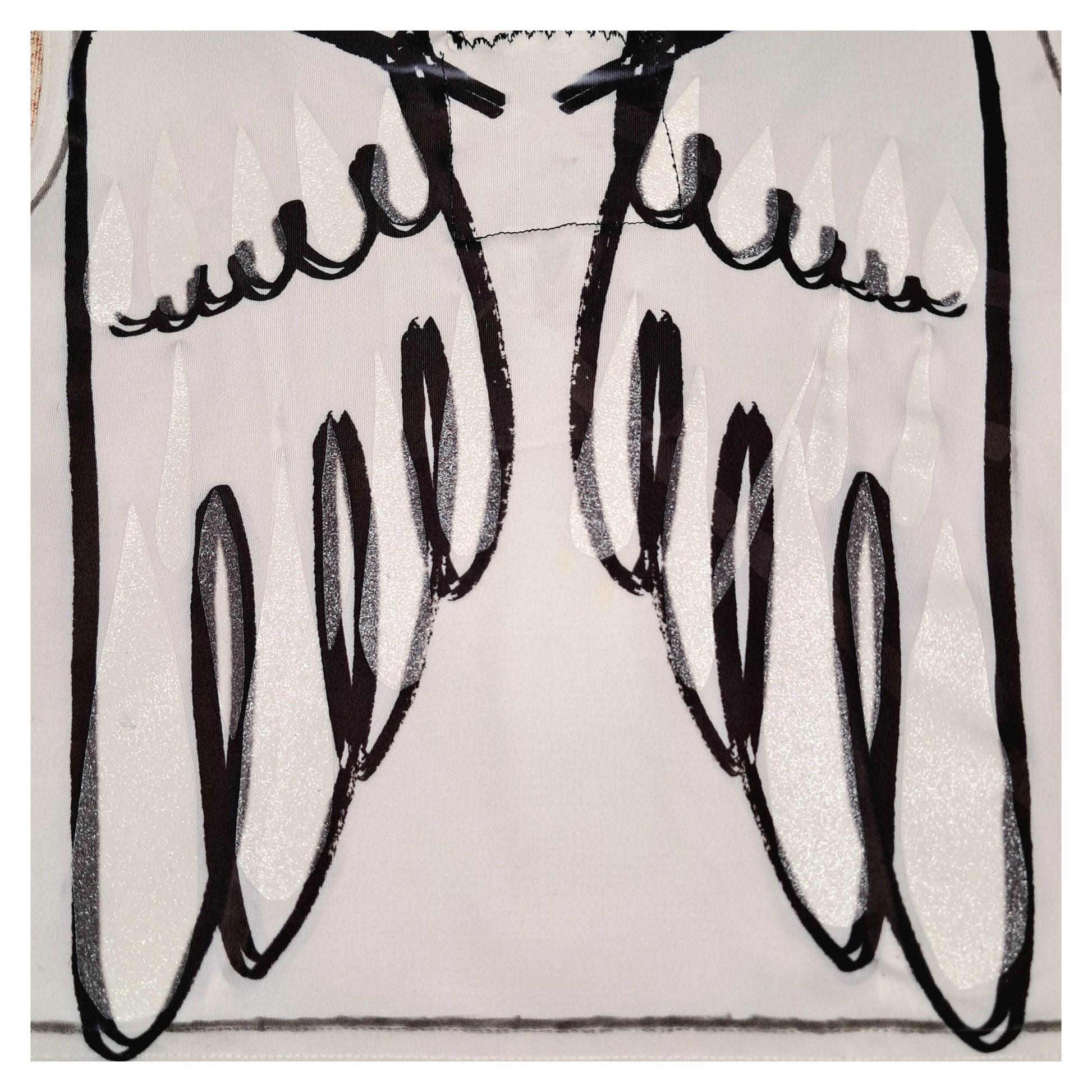 This white crop top is a recycled, one-of-a-kind piece made from saved materials. Heat-pressed angel wings on the back shine with glitter foil, creating a soft yet eye-catching effect. Black hand-painted contours run across the entire top, adding depth and character. The design balances lightness with a bold edge. A conscious choice for those who value individuality over mass production.